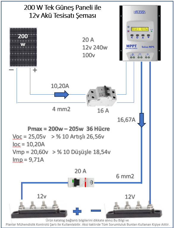 - Bu planda 200w TEK güneş paneli ile 12V Akü tesisat kurulumu yapılmıştır