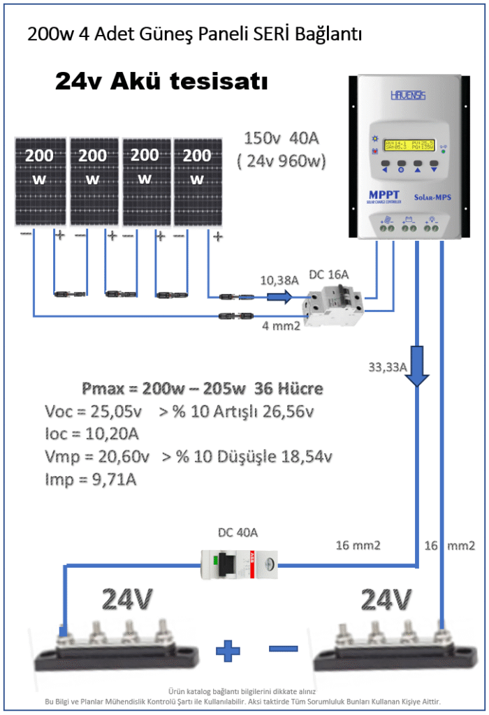 • Bu planda 200w 205w seri bağlı 4 adet güneş paneli ile 24V Akü tesisat kurulumu yapılmıştır